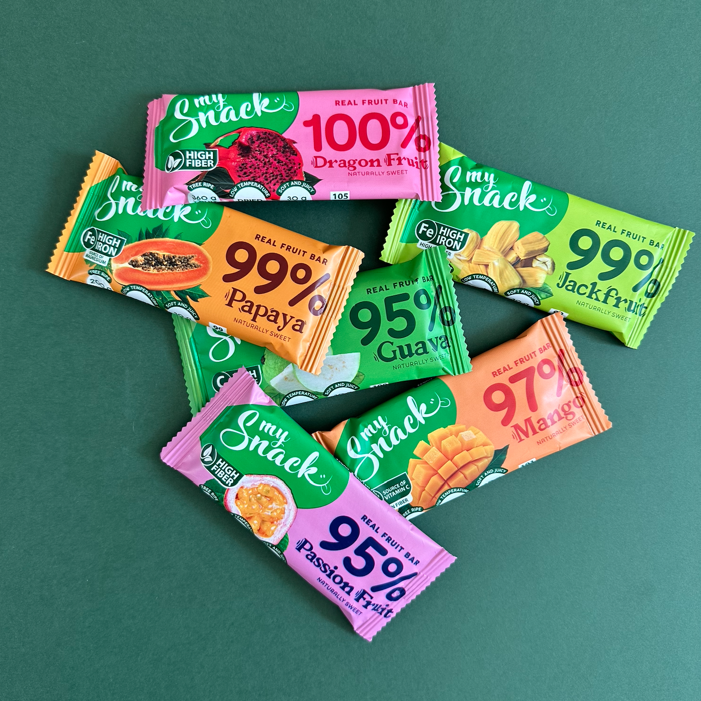 Lisasime meie snäkivalikusse tervelt kuus eriti mahlast puuviljabatooni. Tähelepanelik vaataja nägi juba videost, et kõik MySnacki puuviljabatoonid on valmistatud meie enda retseptide järgi. Batoonides ei ole grammigi kontsentraati ega kasutuid lisaaineid. Need valmivad täitsa teadlikult otse meie farmides või nende läheduses, sest me ei soovi pooltoorelt korjatud vilju üle maailma transportida. Nii saame tuua sinuni viljade kõrgeima toiteväärtuse ja vähendada kahjulikku mõju keskkonnale.